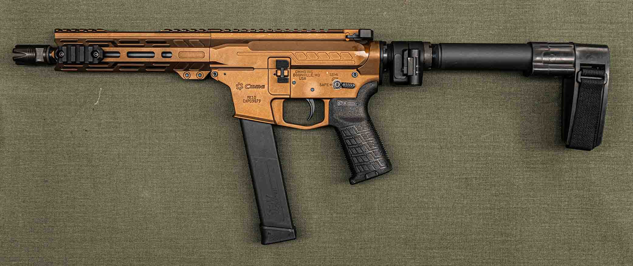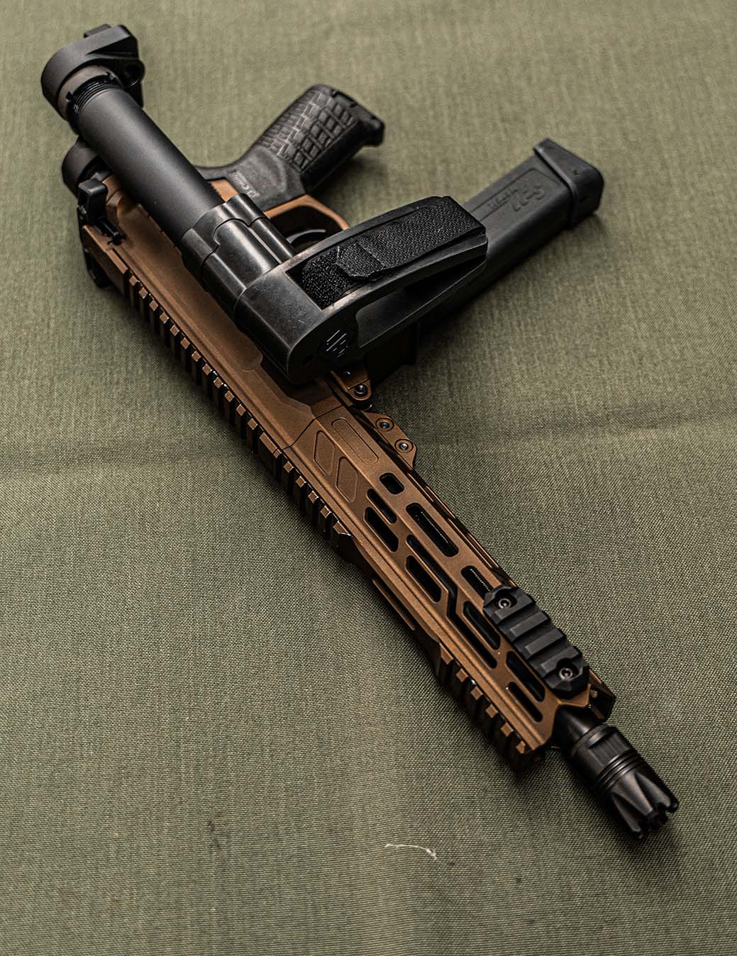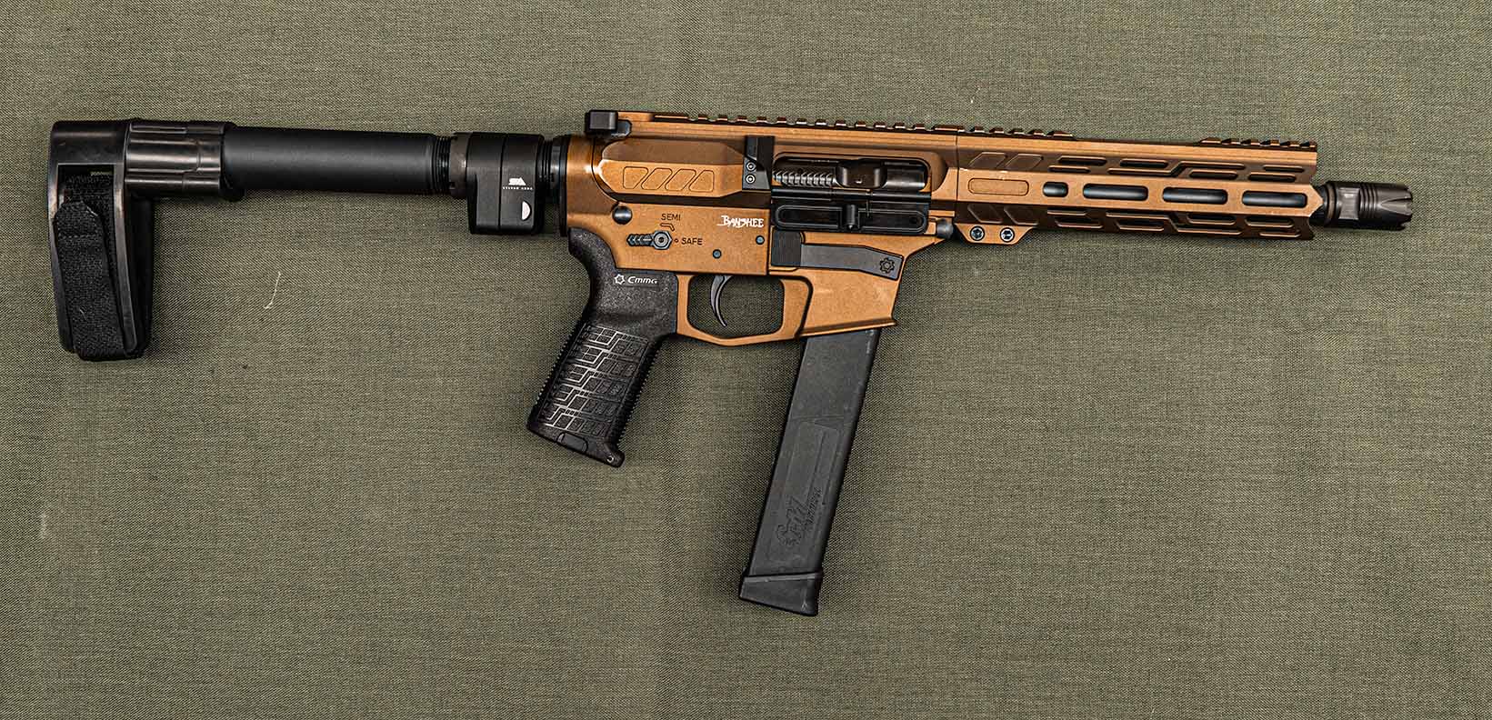 Used, excellent condition, 8″ threaded barrel, bronze anodized finish, M-LOK handguard, side folding pistol brace, 1 – 30 rd Glock mag.