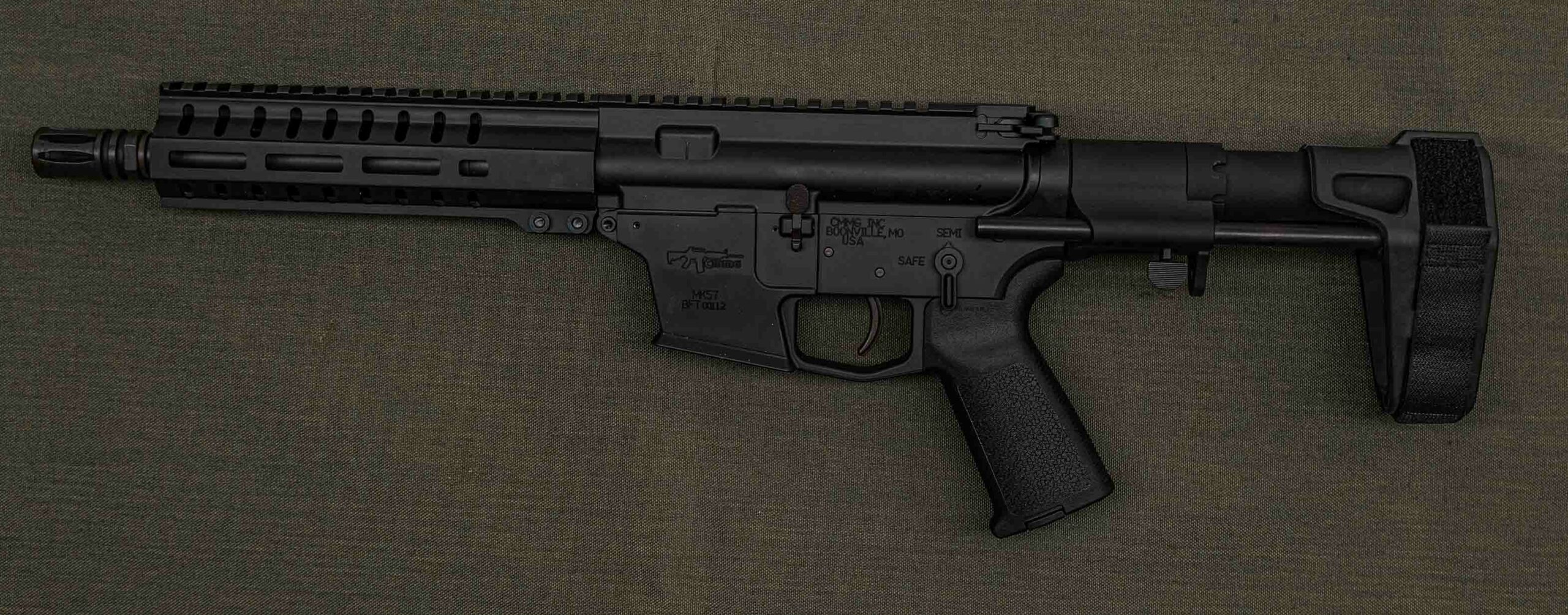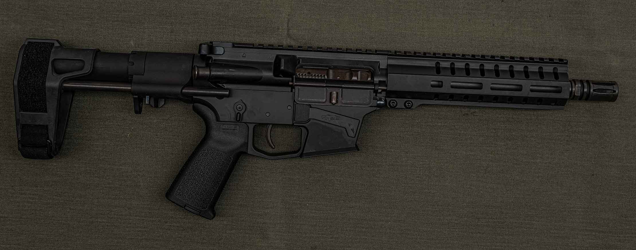 Unfired, factory box, 8″ threaded barrel (1/2×28), flash hider, M-LOK handguard, binary trigger, adjustable PST pistol brace, takes FN pistol pattern magazines (1 – 20 rd included). Black finish.