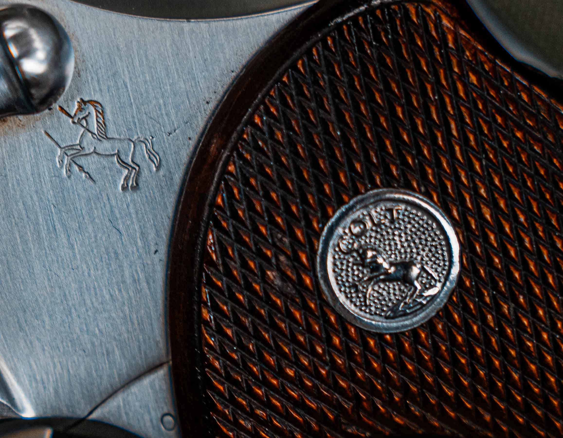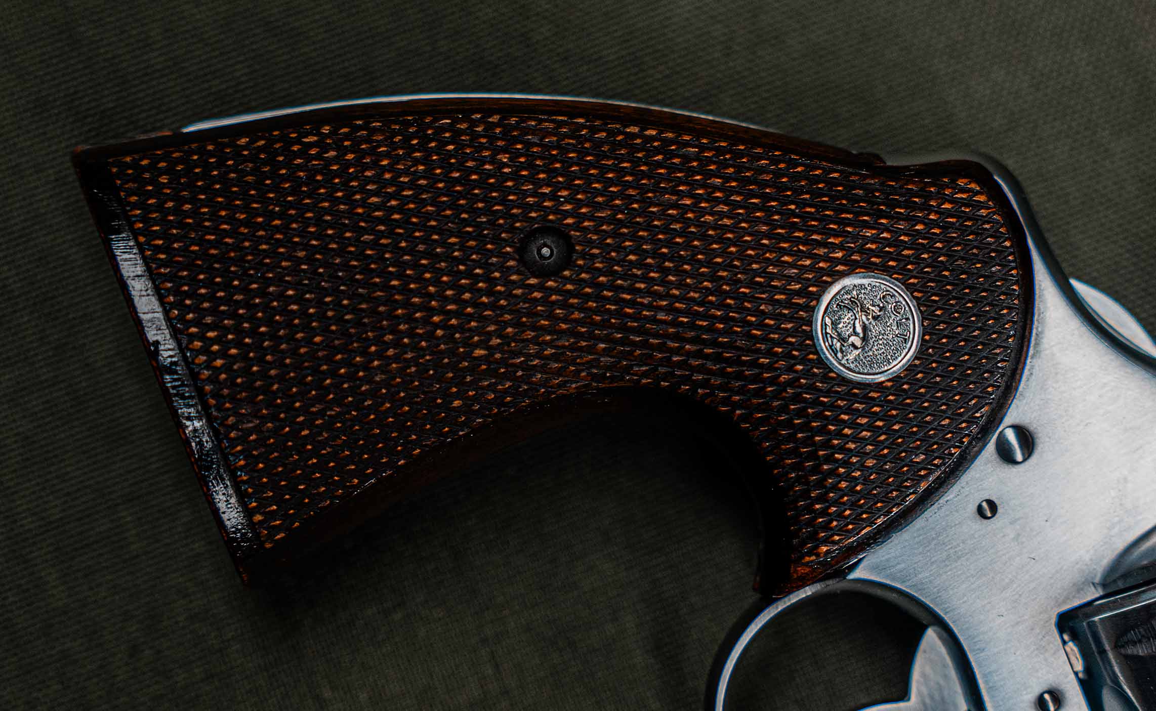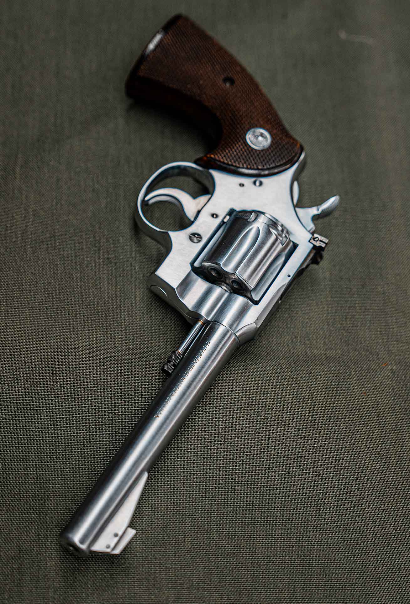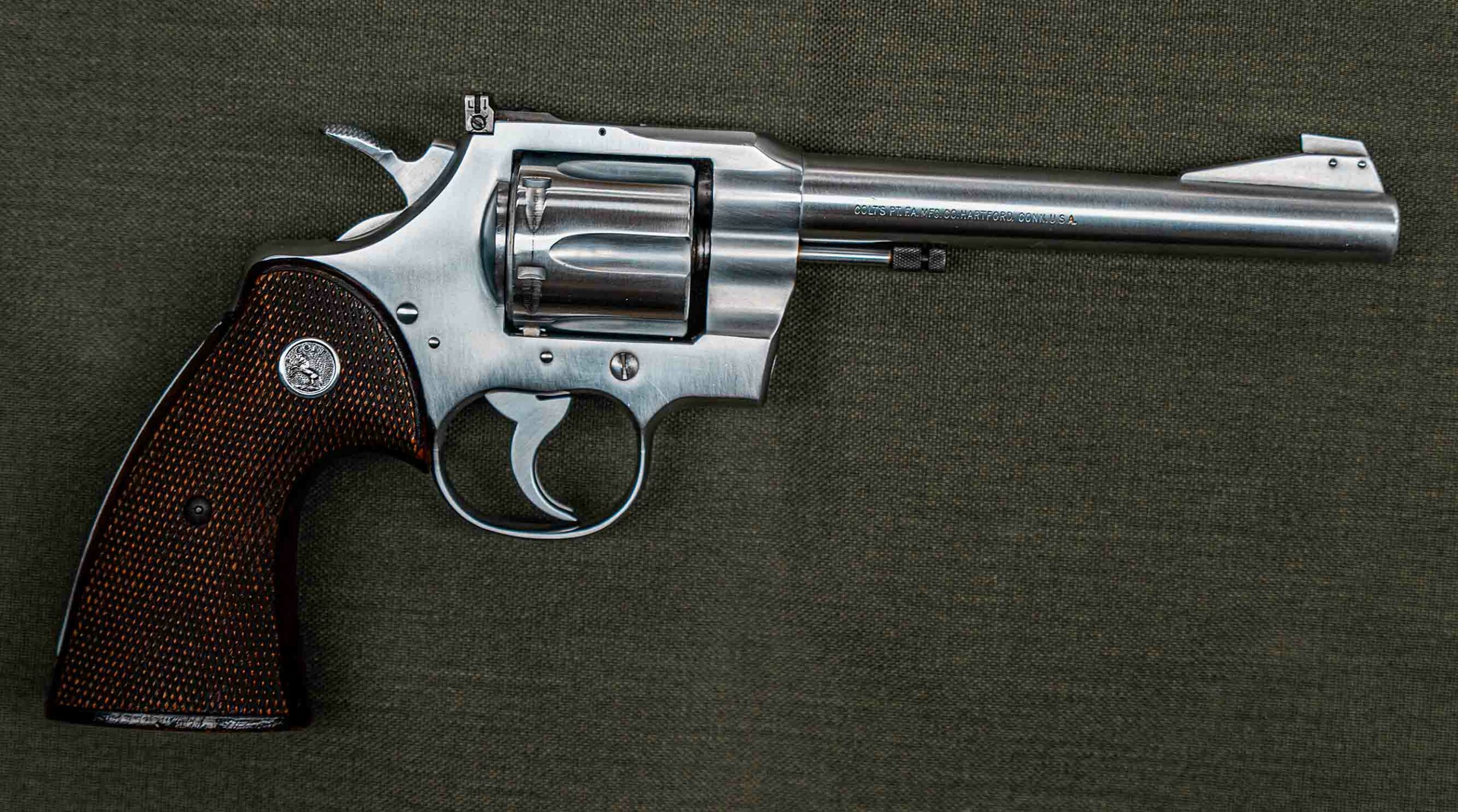 Used, excellent condition, 6″ barrel, stainless steel, wood grips with Colt medallion, 6 shot, single or double action, adjustable rear sight.