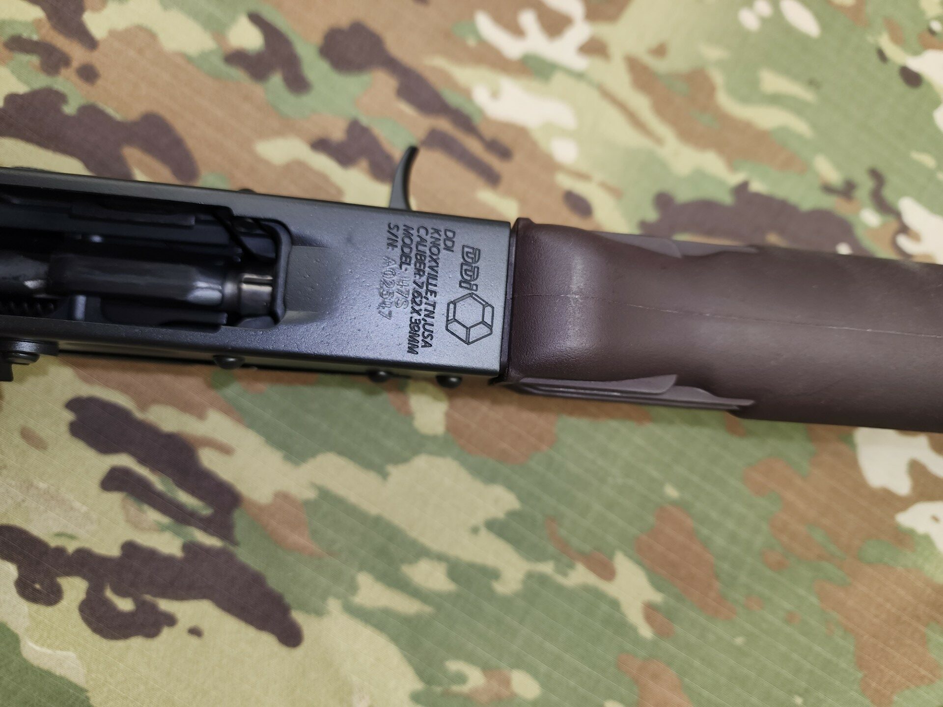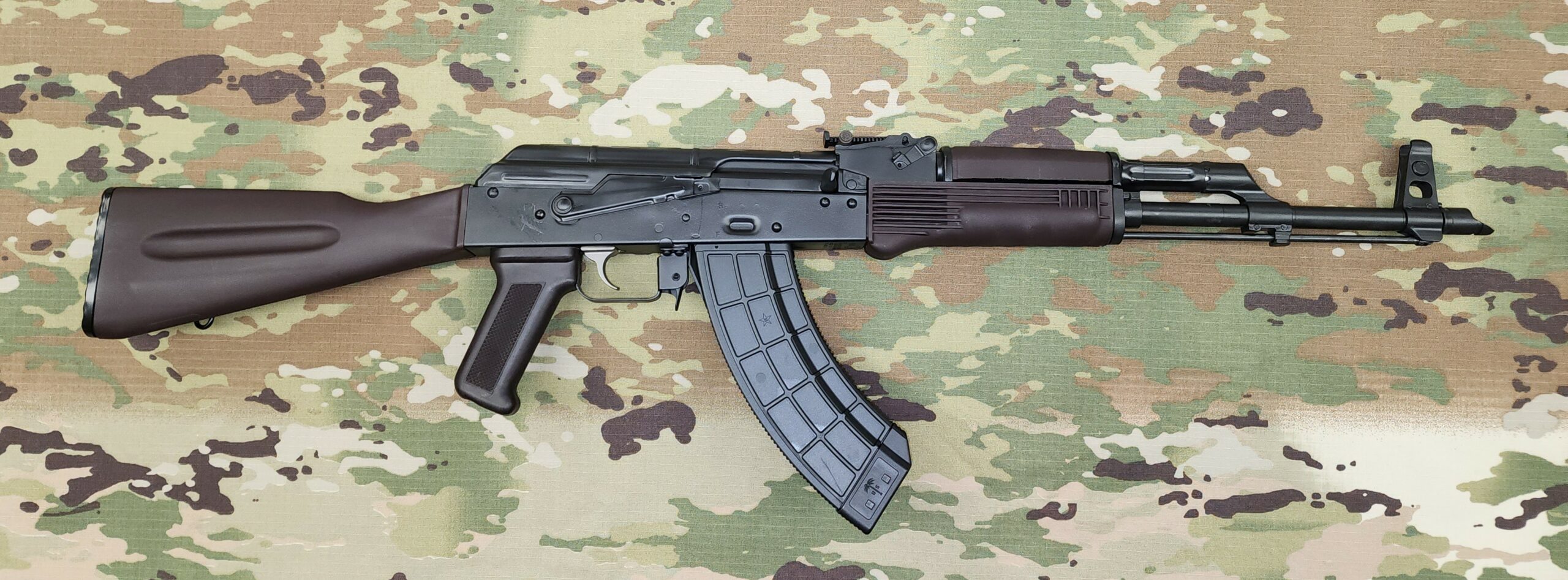 New build, 16″ threaded barrel, slant cut muzzle brake, plum furniture, Romanian parts, side rail, 1 – 30 rd mag.