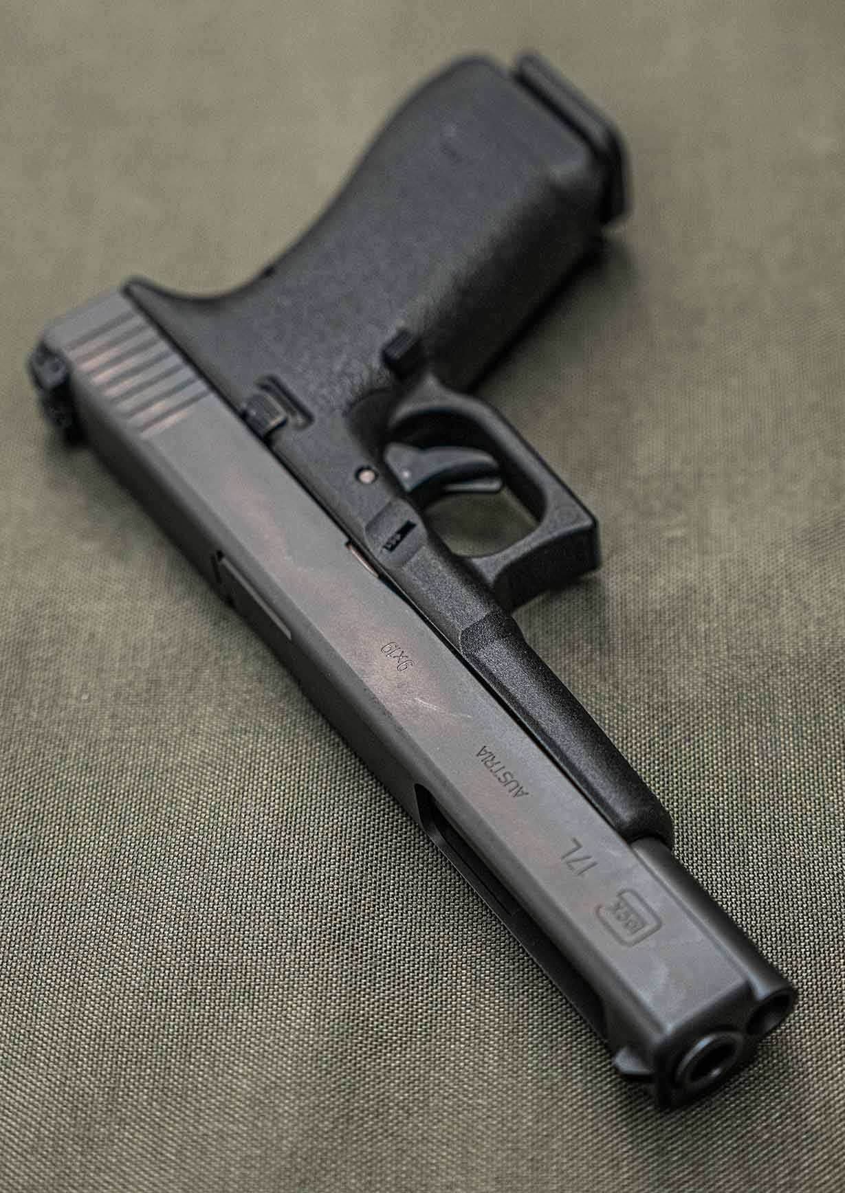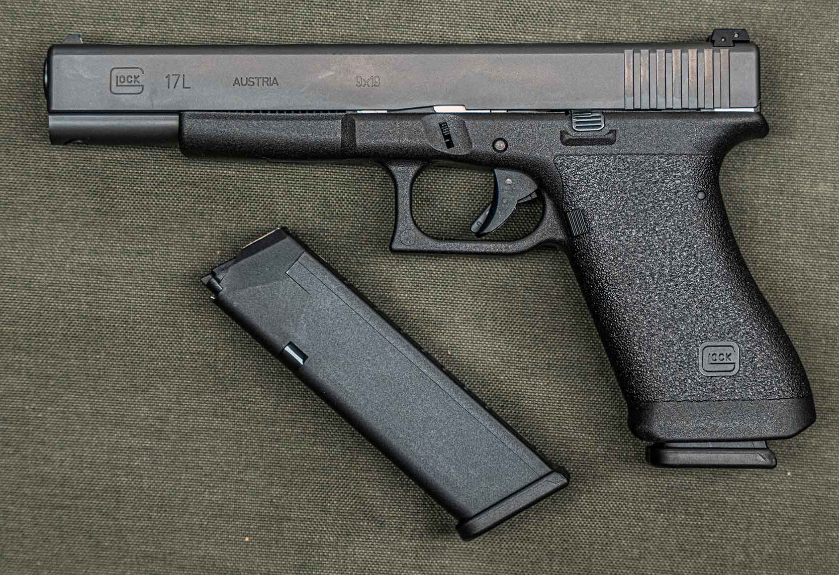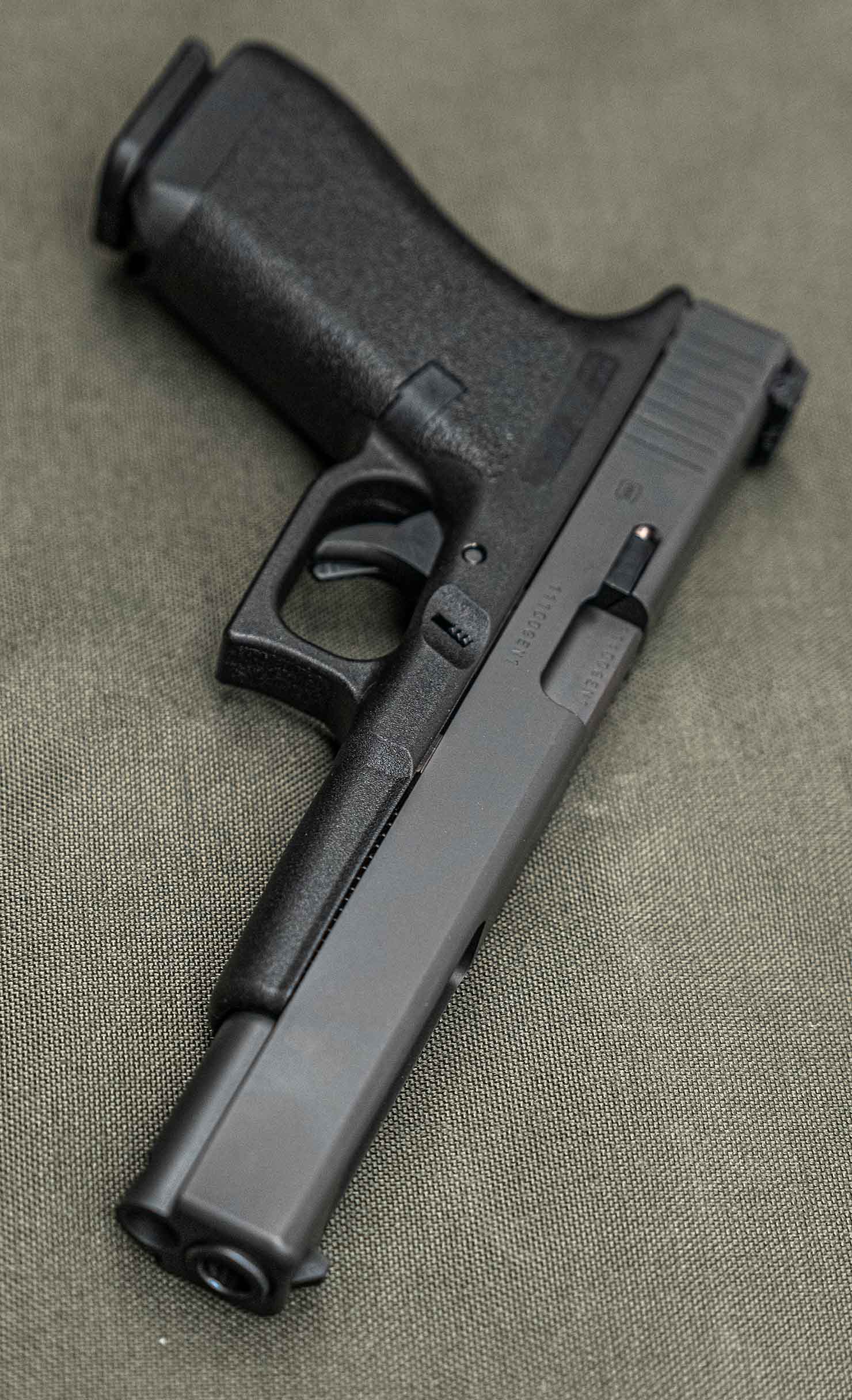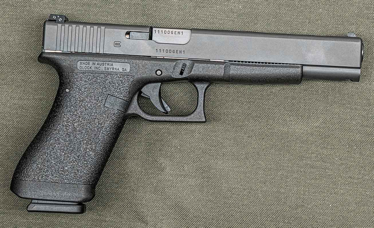 Used, excellent condition, 6″ barrel, black steel slide, adjustable sights, black polymer frame, 2 – 17 rd mags.