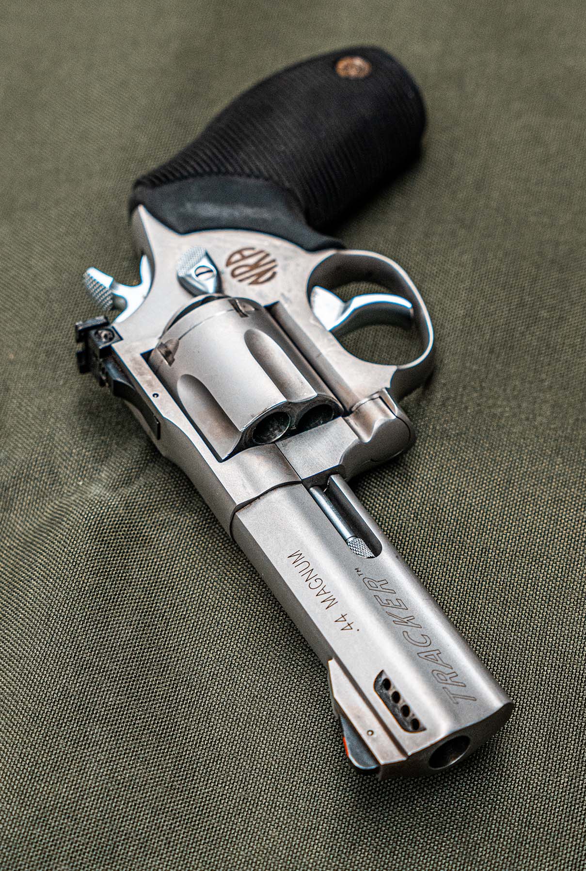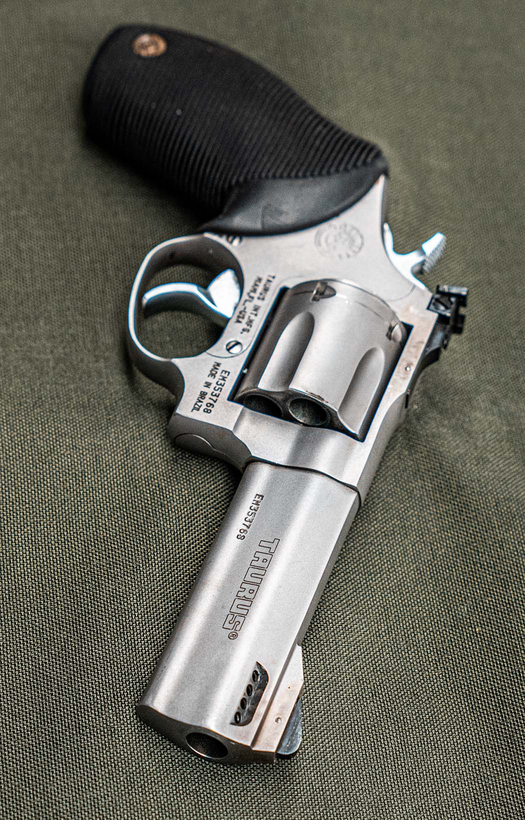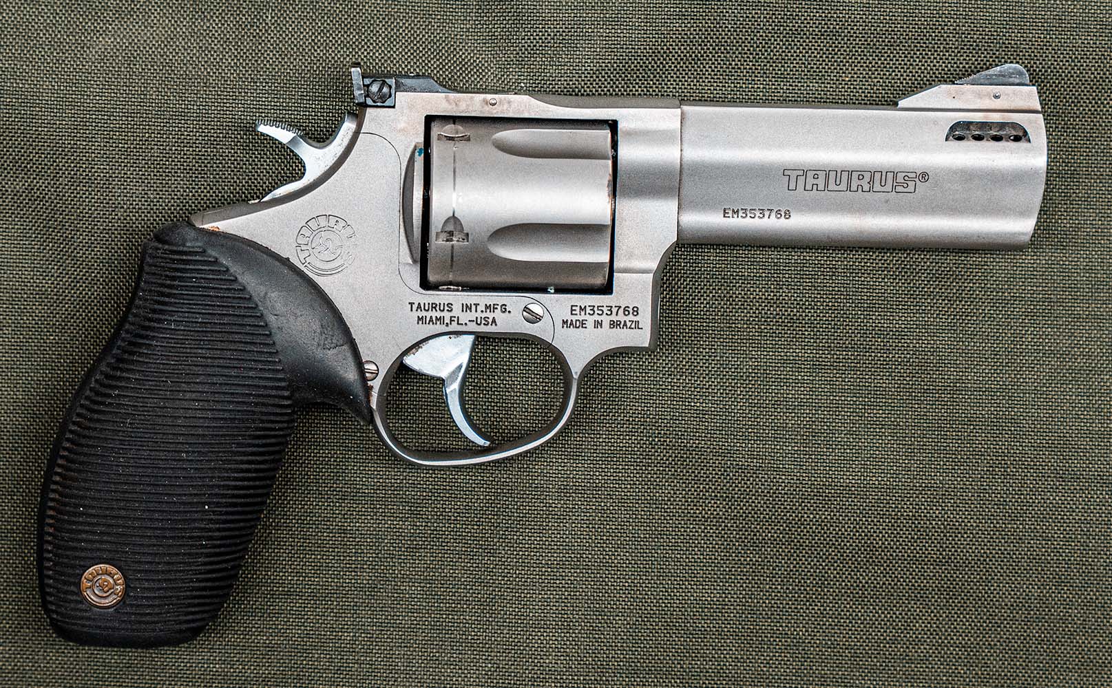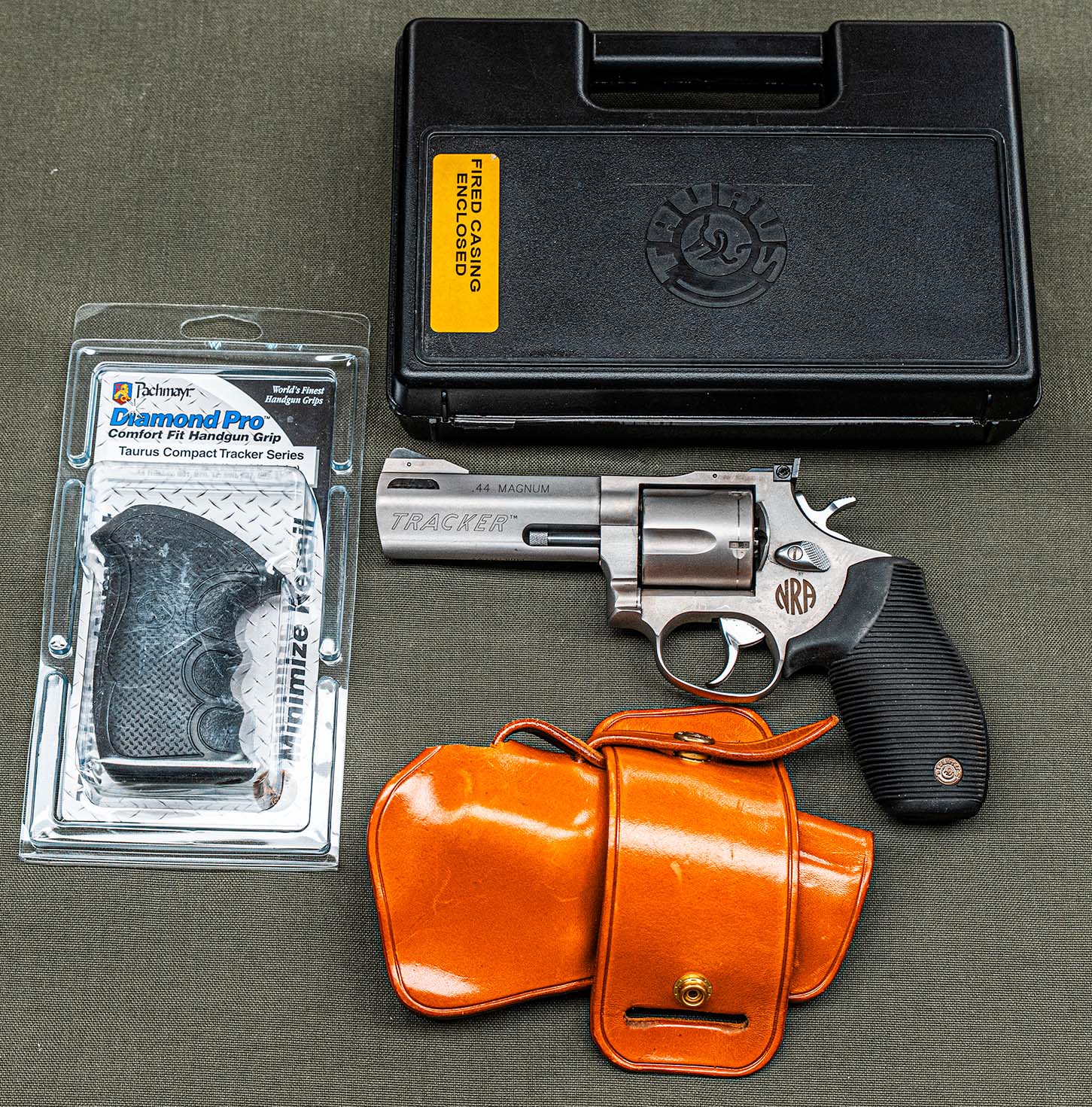 Used, great condition, factory case, 4″ ported barrel, stainless steel, 5 shot, single & double action, extra rubber grips, leather holster, adjustable rear sight. Also fires .44 special.
