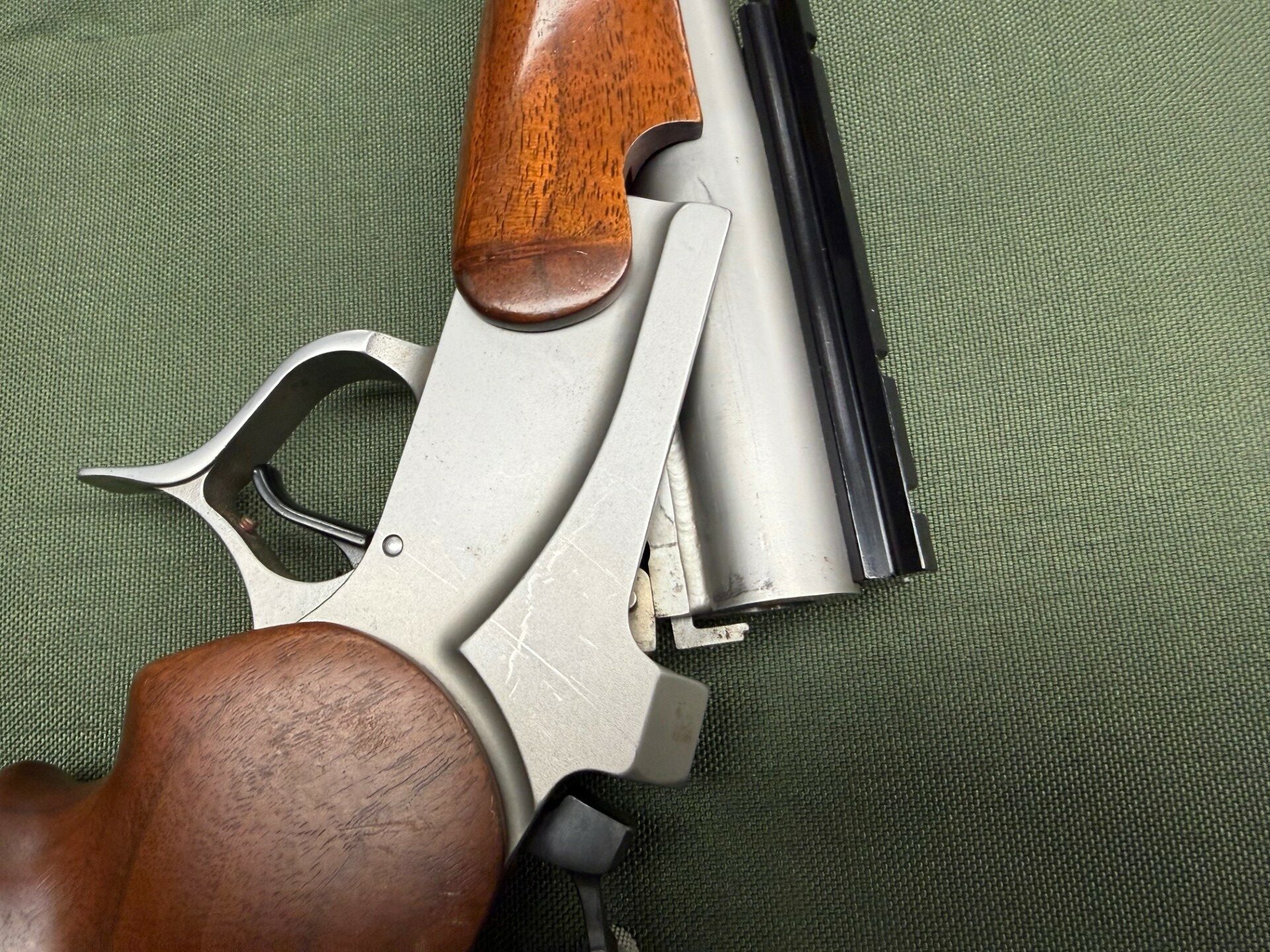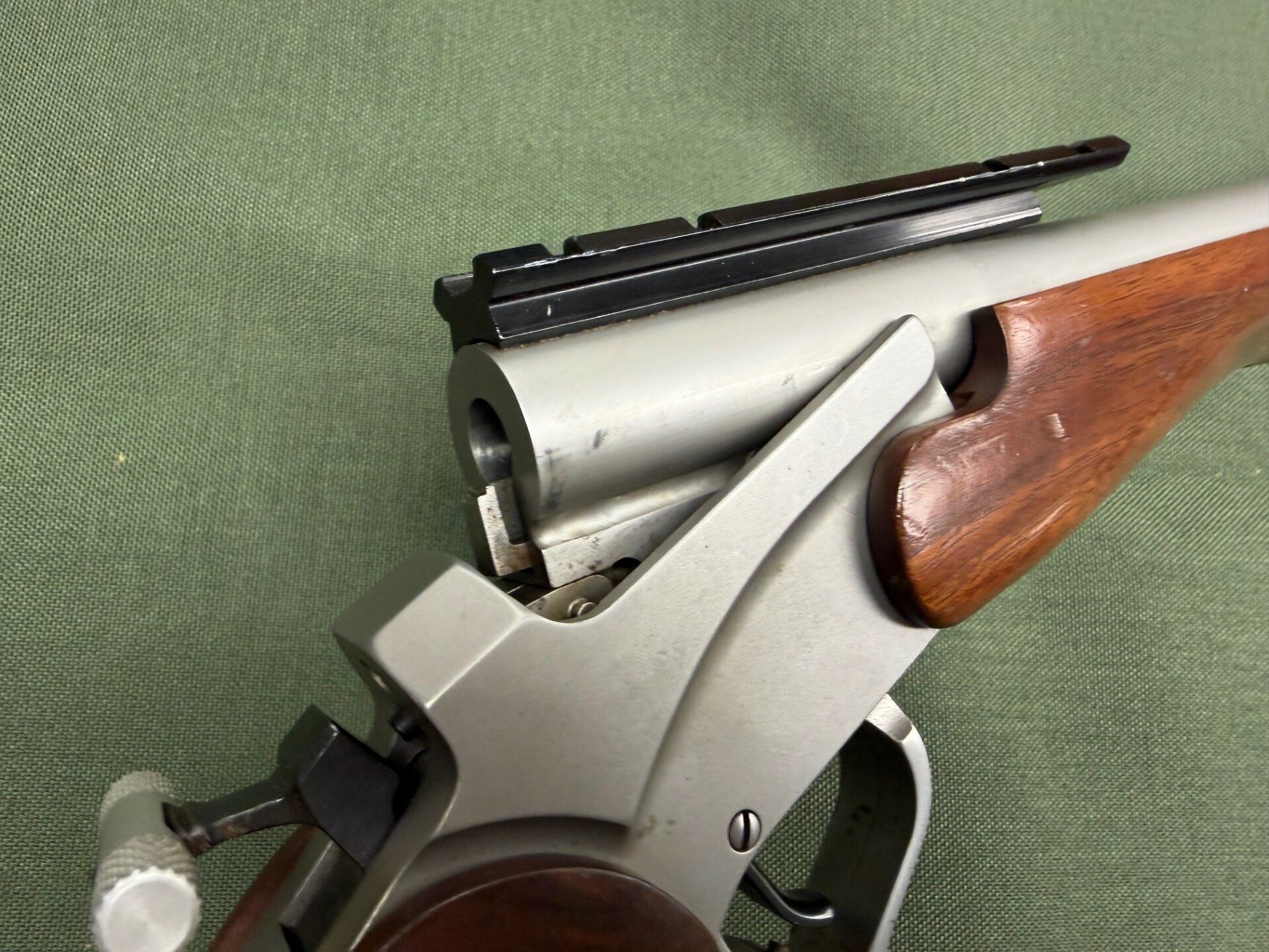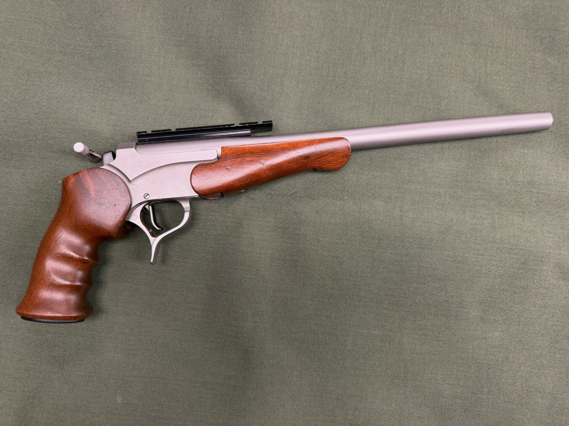Used, good condition, 15″ barrel, stainless steel barrel & frame, bead blasted finish, wood grip, single shot pistol.