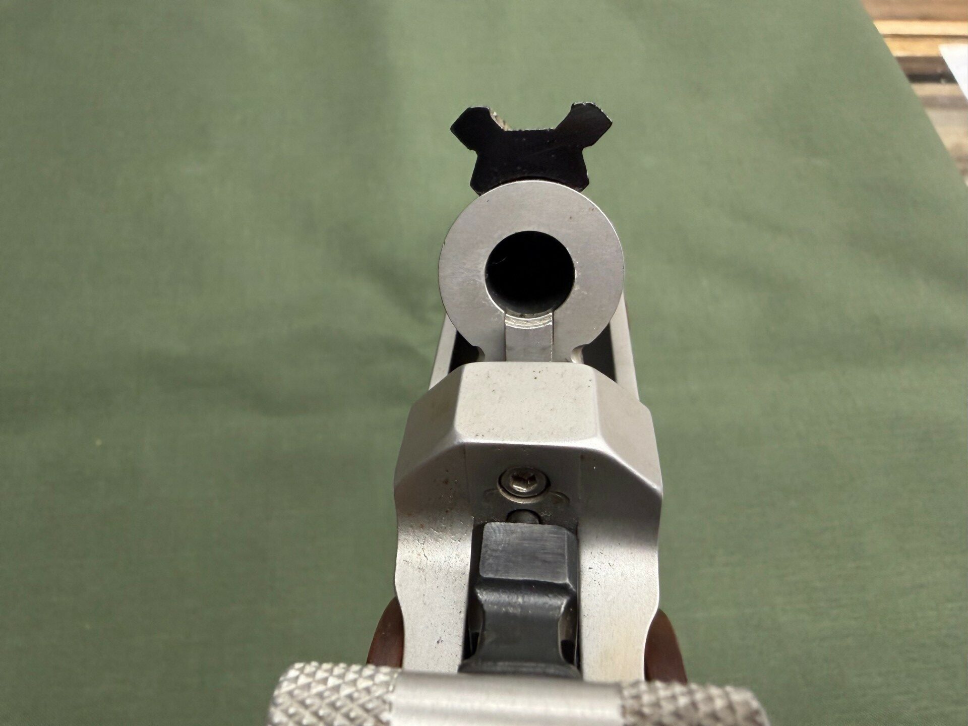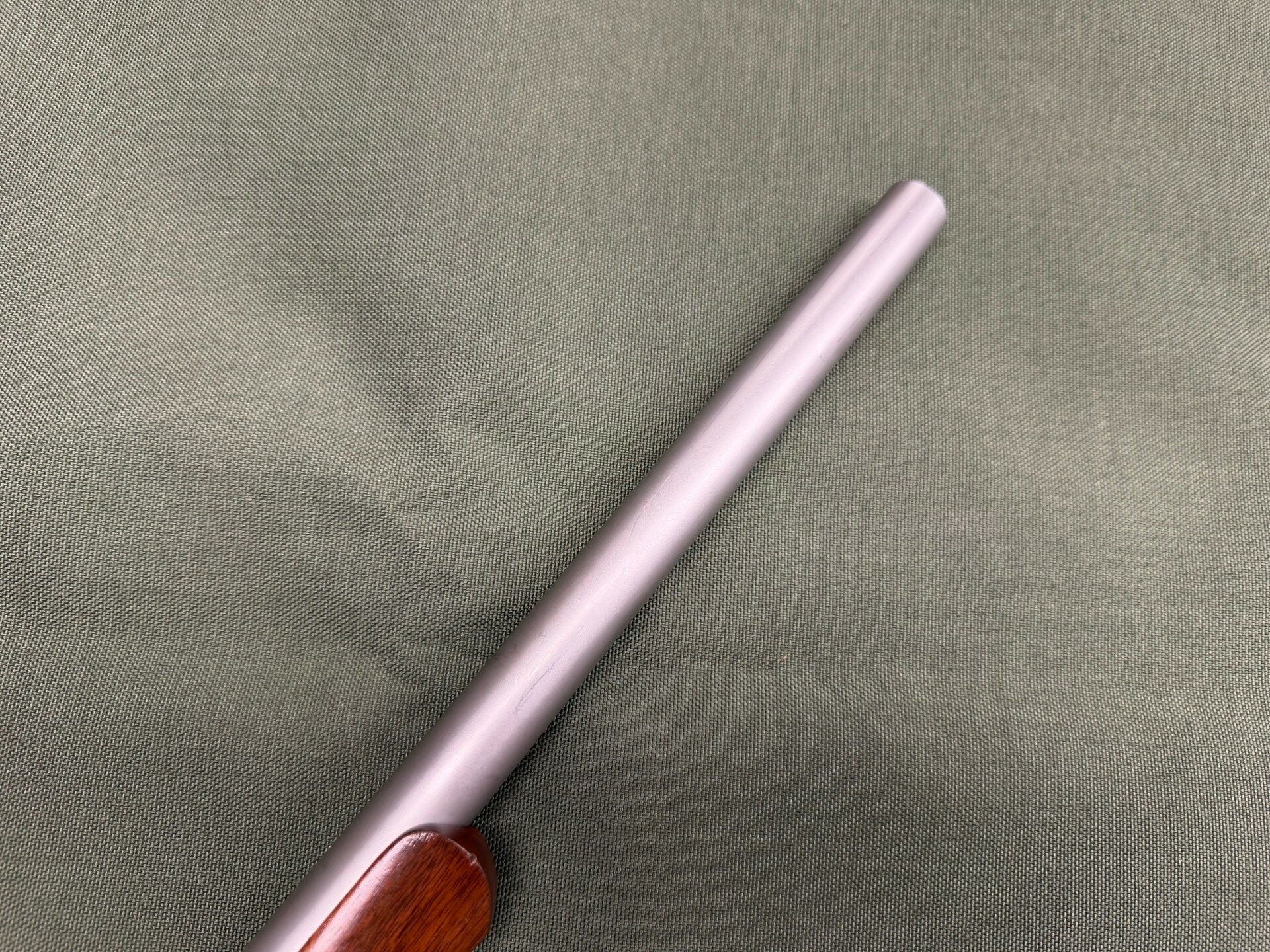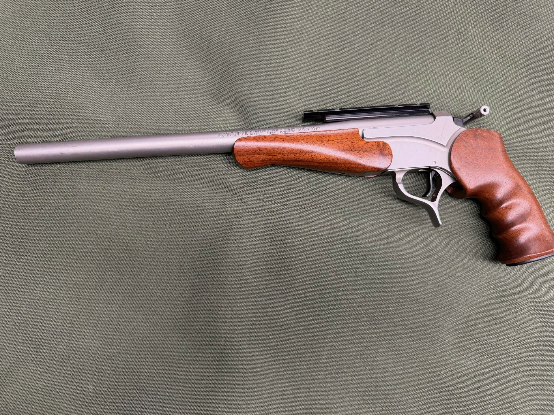 Used, good condition, 15″ barrel, stainless steel barrel & frame, bead blasted finish, wood grip, single shot pistol.
